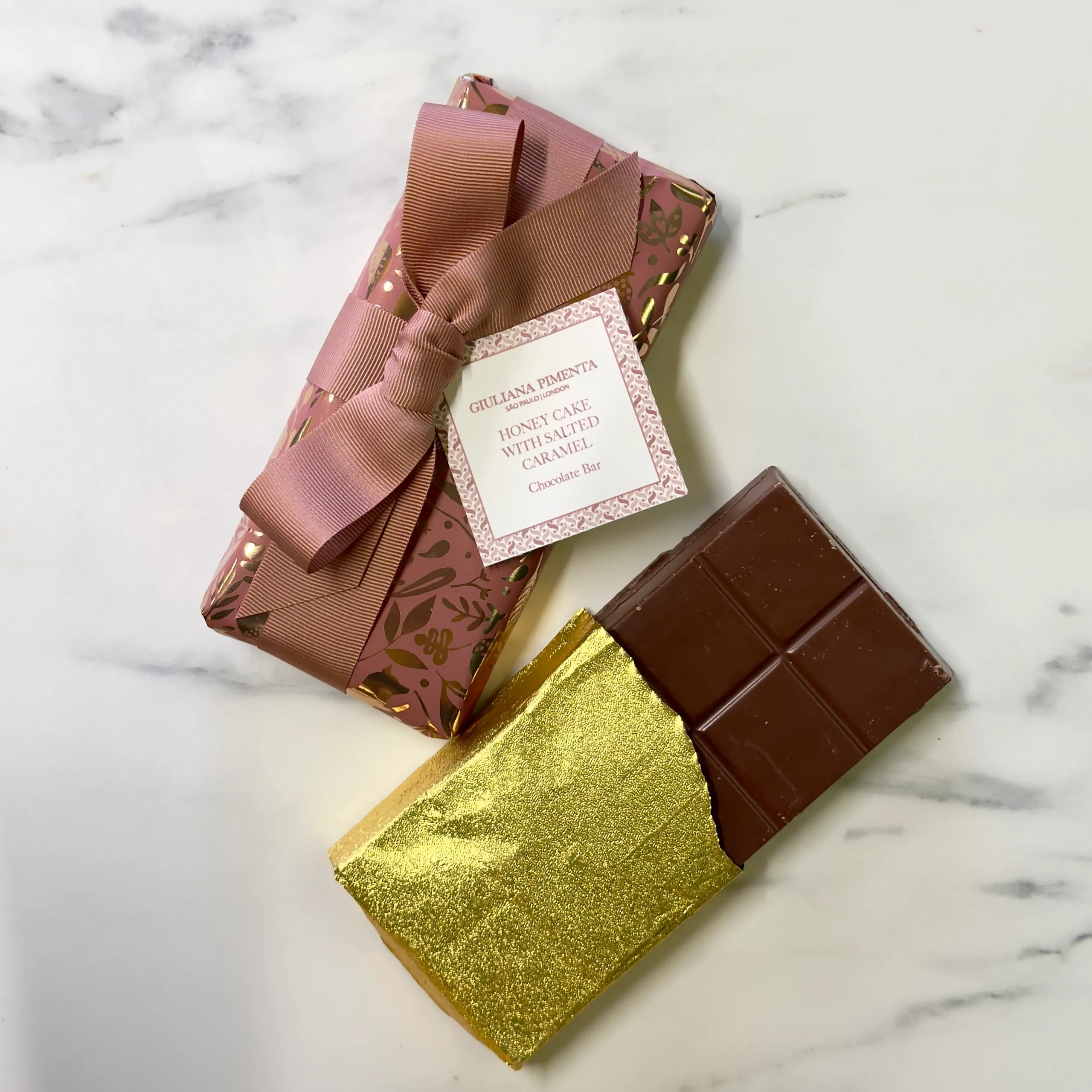 A festive favourite, reimagined. This bar features a soft, aromatic honey cake infused with warm spices like cinnamon and cloves, paired with a silky, luscious salted caramel, all enrobed in premium Belgian milk chocolate.