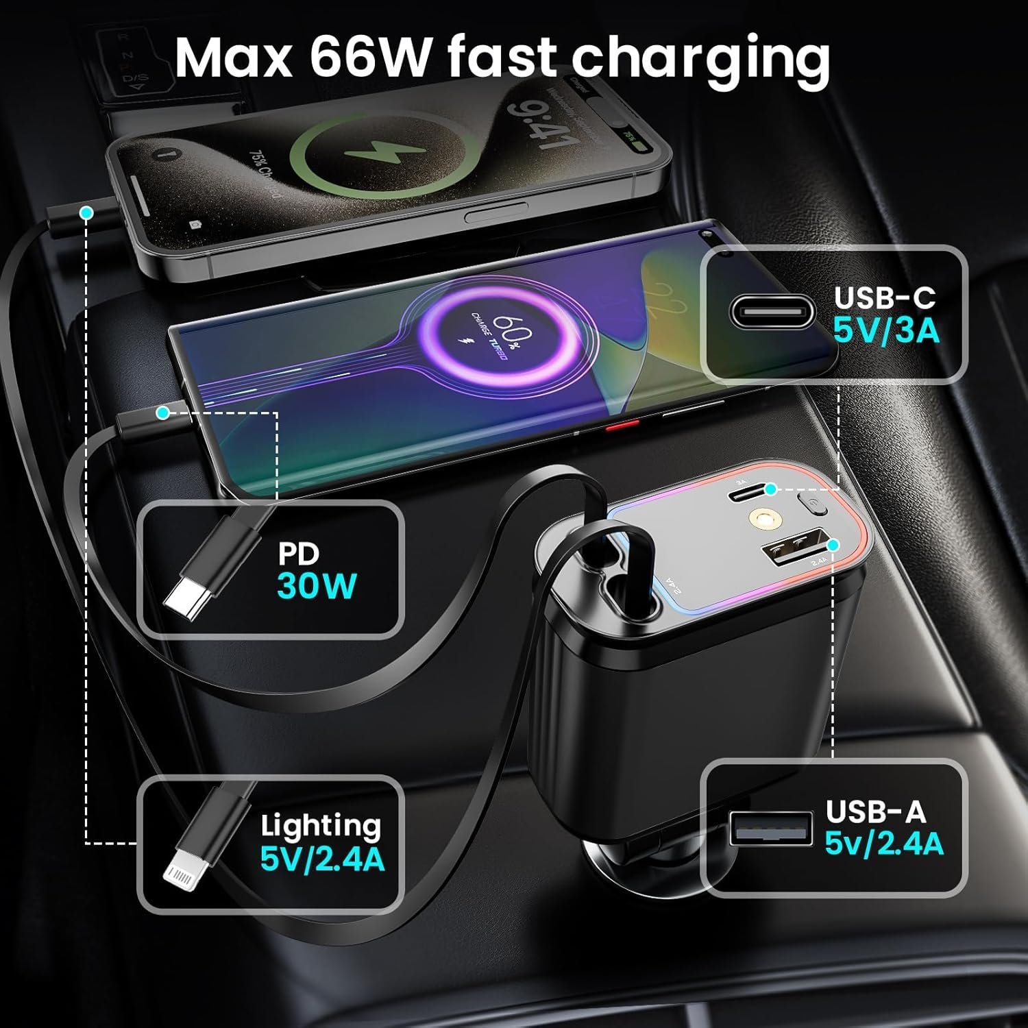4 in 1 Car Charger Fast Car Phone Charger 66W